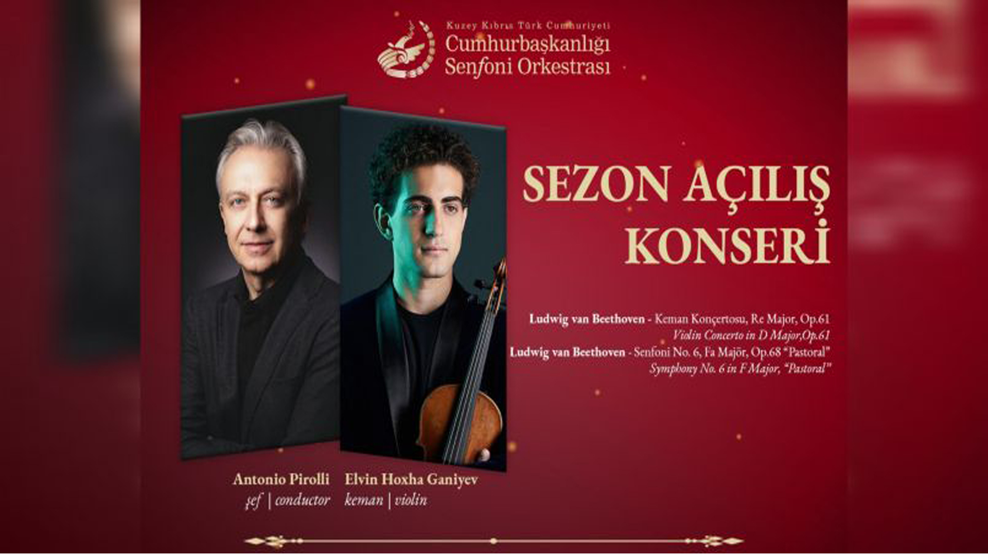 Kuzey Kıbrıs Türk Cumhuriyeti Cumhurbaşkanlığı Senfoni Orkestrası, 2025–2026 konser sezonu açılış konserleriyle sanatseverlerle bir araya gelecektir. Sezon açılış konserlerinin ilki, 30 Ekim 2025 Perşembe, saat 20.00’de, Gazimağusa Rauf Raif Denktaş Kültür ve Kongre Sarayı’nda gerçekleştirilecektir. İkinci konser ise, 31 Ekim 2025 Cuma, saat 20.00’de, Cumhurbaşkanlığı Yerleşkesi “Mavi Salon”, Lefkoşa’da müzikseverlerle buluşacaktır. Orkestra şefi Antonio Pirolli yönetiminde ve keman sanatçısı Elvin Hoxha Ganiyev’in solist olarak katılımıyla gerçekleşecek olan Sezon Açılış Konserlerinin program kapsamında Ludwig van Beethoven’ın Keman Konçertosu Re Majör, Op. 61 ve Senfoni No.6 Fa Majör, Op. 68 “Pastoral” eserleri yer alacaktır. Konserler, Türkiye İş Bankası’nın ana sponsorluğunda, Kuzey Kıbrıs Turkcell’in iletişim sponsorluğunda, Gazimağusa Belediyesi, Doğu Akdeniz Üniversitesi ve Sky Roof Hotel iş birliğiyle düzenlenecektir. KKTC Cumhurbaşkanlığı Senfoni Orkestrası’nın yeni sezon açılış konserleri halka açık ve ücretsizdir.