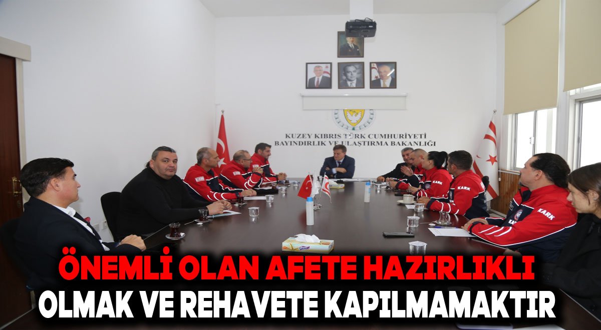 Bayındırlık ve Ulaştırma Bakanı Erhan Arıklı, Kıbrıs Arama Kurtarma Derneği (KARK) Başkanı Muhammet Öksüzali ve beraberindeki heyeti kabul ederek, “Önemli olan afete hazırlıklı olmak ve rehavete kapılmamaktır.” dedi. Bakanlık’tan verilen bilgiye göre, kabulde, Bilgi Teknolojileri ve Haberleşme Kurumu Başkan Yardımcısı Tayfun Aydınlı ve Meteoroloji Dairesi Müdürü Sinan Güneş de hazır bulundu. Bakan Arıklı kabulde, afetlere hazırlık konusunda sivil toplum örgütleri ile gönüllü arama kurtarma ekiplerinin hayati öneme sahip olduğunu vurguladı.